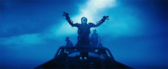 There are so many images throughout that we can analyze in that manner, and it’s wonderful to see an action movie use its visuals to convey a story rather than convey the fact that a building is being blown up or a city is having the shit kicked out of it by aliens. And as action set pieces themselves, Fury Road contains some of the most exhilarating sequences I’ve ever seen in film. Whether it’s the Doof Warrior playing that awesome guitar, the Bullet Farmer shooting wildly into the air, Max and Furiosa fighting together, or the audience getting a bird’s eye view of the action, what’s clear is that Miller understands what makes an action movie work. It’s not just the action; it’s everything that is created by the action.