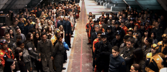 The trial of Gaius Baltar sets up a courtroom that is permeated by history, fraught with tension, and caught between shifting allegiances. For the first time since right around New Caprica, we get a sense of the toll the experience took on the fleet, a sense of the simmering tension that has been building up over the weeks. Director Michael Rymer has his camera pan over the crowd and linger on faces, underscoring the bitterness and betrayal, the desire for revenge, and when the words hit, they hit with an icy bluntness that strikes to the core of the show’s relationships and themes. This is a trial surrounding one man’s life, but the implications of a guilty or not guilty verdict–as well as of the legal process itself–are far-reaching.